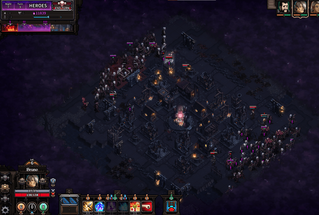 You are thrust in the hallowed remains of a once proud town, inhabited by three randomly generated warriors and a few buildings bereft with squalor. Place your heroes, who all have their own strengths, weaknesses and backstories, and prepare for the oncoming hordes. The Last Spell is broken intro three phases; deployment, building, and defense. Equip, position, and prepare your heroes during the deployment phase. Build mines, shops, inns, and defenses during your building phase. And when nightfall descends, you must use everything at your disposal to protect your city from the never-ending hordes. Your units, often defined by the gear you equip them with, can be customized and leveled to your liking. Though the game will typically push you towards having a warrior, mage, and ranger, you may pick and choose at will. If you notice your warrior seems more suited to a bow, feel free to change his equipment. You may also teach your units new spells and abilities, the game gives you all the options you could desire. There are a ton of buildings, defenses, and more to unlock as you progress through the game. Each new option allowing a differing path or option or tool to utilize against the ongoing threats. Combat is incredibly easy to pick up but hard to master. Characters gain stacking buffs and traits as they level so be prepared to strategize your composition. Each level up also provides you reroll tokens so if you don’t see the stats or buffs you want, you do have a chance to change them. The randomness of this game never seemed unfair or punishing. The developers found a healthy amount is not overwhelming but forgiving.