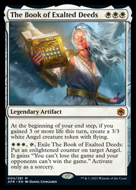 The Book of Exalted Deeds or as I like to call it, “Build your own Platinum Angel.” An enchantment that gives value for gaining life that can also give you a can’t lose condition? Sign me up. I imagine most Mono-White decks will sideboard two of these but I just really like the idea of this can’t lose, can’t win counter. There is no other card like this in Magic. 10/10 flavor and I can’t wait to play it.