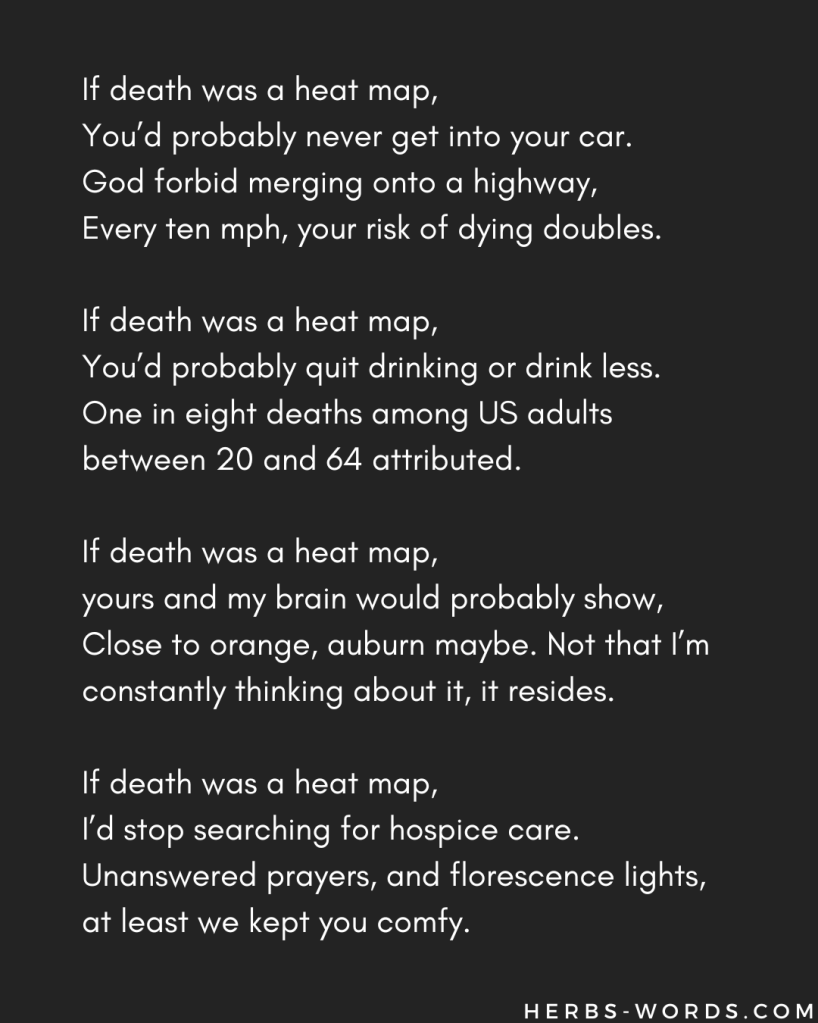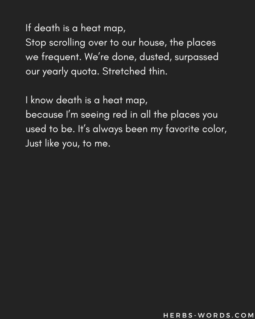 I’ve been trying new ways to deal with shared grief. My partner and I have struggled this year, but we’ve made do well enough. Spent most of our Friday night discussing grief and its intricacies. Plotting it, enacting theory, harping on a singular question: shouldn’t I be better at this? If I shoulder so much weight, have experienced so much loss and grief, should I not have improved in my ability to administer it? Or perhaps more importantly, shouldn’t I be better at helping others through theirs? A tireless endeavor but one of significant worth, real world applications, potential ROI, shareholder value. So here I am trying narrative poetry theory. I will use the title above as chapters or perhaps letters in an epistolary novel (shout out to Shelley).