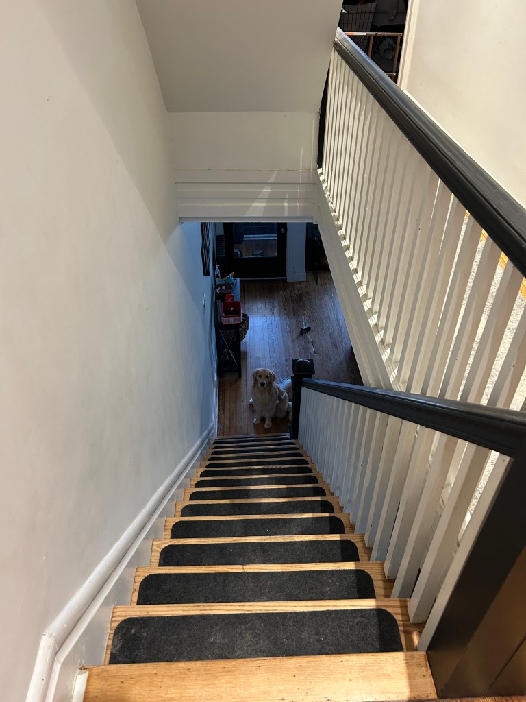 sounds of paws on hardwood followed by footsteps